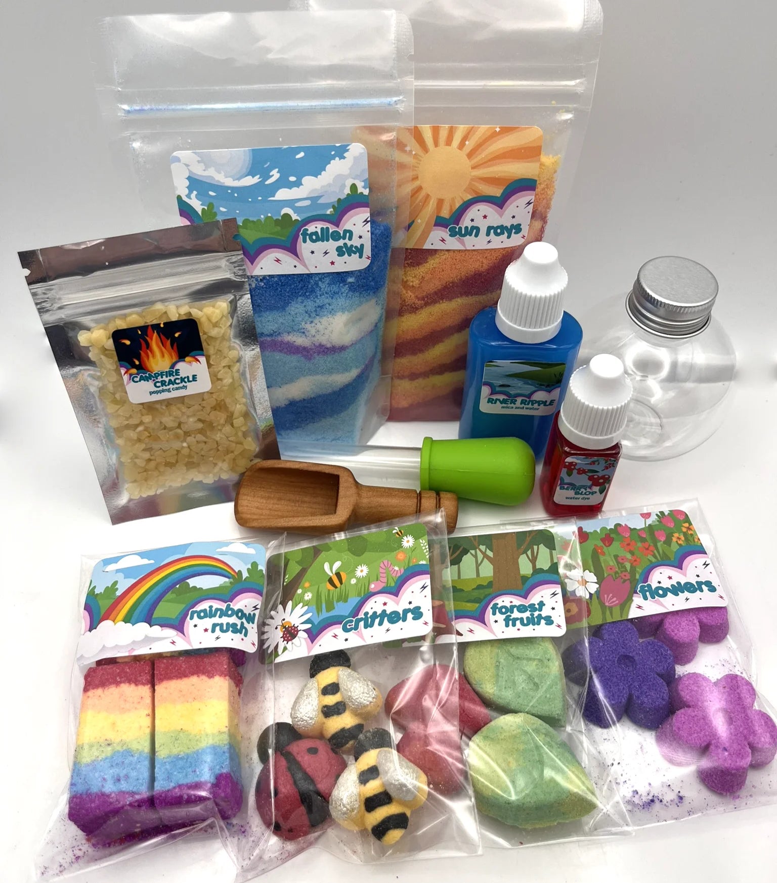 Inspired by Mother Nature, the ingredients are designed to inspire a love of outdoor play. Stir up the blue, white and purple Fallen Sky, add Flowers and pop in a few critters. Add Undergrowth and Rainbow Rush Rocks for a colourful explosion and squeeze in River Rush for extra sparkle. Berry Blop brings a blast of liquid fruity goodness and Campfire Crackle adds another sensory note. Our medium kit brings the vivid red, orange and yellow of Sun Rays.